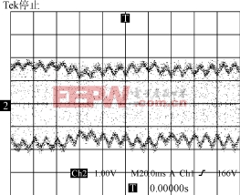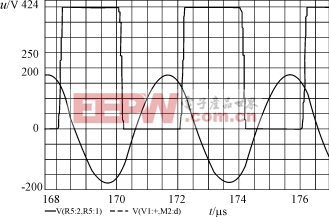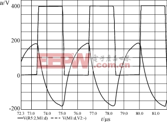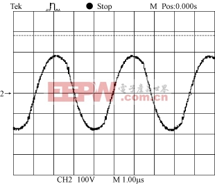 图5给出了灯电压波形,由于高频下金卤灯近似为一纯电阻,所以电流波形与电压波形相同。由图5中可以看出,开关管是在电流波形有缺口处,即在电流过峰值开始下降后关断。在此情况下,MOS管的开关损耗大为降低。