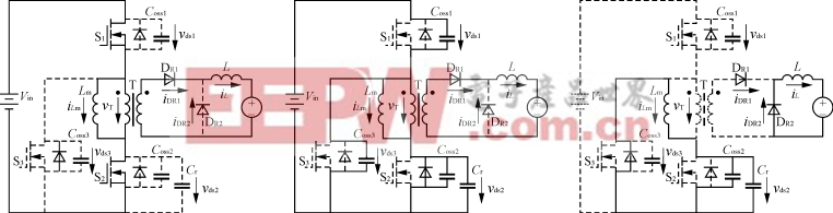 该变换器的另一优点是可以工作在占空比大于50%的状态下。如图4所示,当主开关S1及S2同时导通,辅助开关S3截止时,加在变压器原边的电压为正,大小等于输入电压。当主开关S1及S2同时截止,辅助开关S3导通时,Lm和Cr谐振在Cr上产生的电压对变压器进行磁复位。通过选择较小的Cr值,该复位电压可以大于输入电压,使得变压器的复位时间小于正向导通时间,从而得到一个大于50%的占空比。这样的好处是既可以减小变换器一次侧的导通损耗,又可以减小二次侧整流二极管的电压应力。