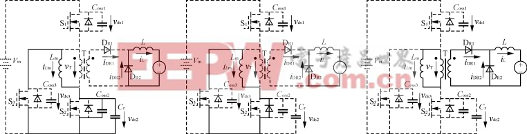 根据以上的分析可以看出,S1及S3为一对互补开关,两者寄生输出电容上的电压vds1与vds3之和等于输入电压Vin。因此,当其中vds1(或vds3)等于零时,vds3(或vds1)就等于Vin,可见开关S1及S3的电压应力均为输入电压。