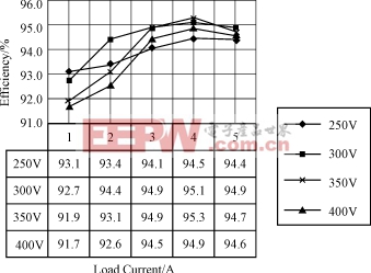 图6给出了该变换器在不同输入电压,不同负载电流下的转换效率。最高效率达到了95.3%。