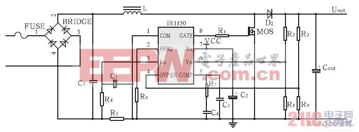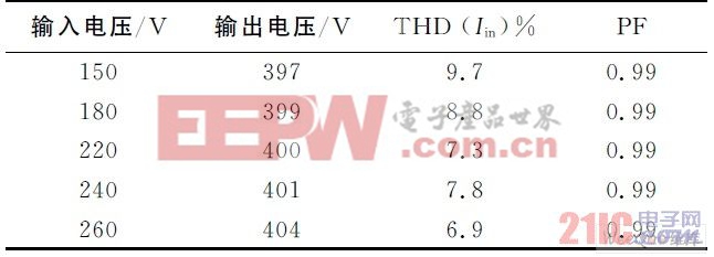 根据测试结果,可以看出经IR1150 校正以后,电压和电流波形同相位,输入电流为正弦波,不再是脉冲状;输入电流的总谐波畸变率降到了10 %以下;功率因数提升到了0.99 以上;同时输出电压在较宽的输入电压范围内(150 ~260 V)均能保持恒定。
