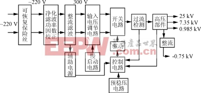 高压电源已经被广泛地应用?医学、工业无损探伤、车站、海关检验等检测设备中,也广泛应用于诸如雷达发射机、电子航空图显示器等军事领域。传统的高压电源体积大、笨重,严重影响了所配套设备的发展。目前的高压电源多采用开关电源形式,大大降低了体积重量,增加了功率,提高了效率。特别是高压小功率开关电源,几乎都是开关电源结构。本文所讨论的高压小功率开关电源,是为X射线电视透视系统配套设计的。这种系统是对原始X射线设备的改进,它增加一个叫做图像增强器的设备。这种设备采用电极对电子进行加速和聚焦,因而需要与之相配套的小功率高压电源。