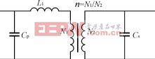 高频高压变压器是高压电源的核心部件。在低压(功率)变压器中,可以不考虑波形的畸变和工作频带的问题,因而可以忽略分布电容的影响。在高频高压变压器中,由于匝数增多,特别是次级匝数增多,当变压器工作频率比较高和电压变化率比较大时,必须考虑分布电容和漏感问题。这时,变压器模型如图2所示。L1为漏感,Cp和Cs分别为初级和次级的分布电容。变压器漏感L1和次级分布电容构成了串联谐振电路。当变压器次级开路或负载较轻时变压器可看成电感,因而与次级分布电容Cs构成并联谐振电路,其等效电路如图3所示。发生谐振时,电容两端的电压会高出工作电压,也就是说变压器内部的电压会高于输出电压。这无形中增大了对变压器的耐压要求。因而在变压器的绕制过程中,要尽量减少分布电容和漏感。假设各层电容相等,绕组共有m层,则分布电容Cs=