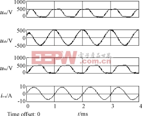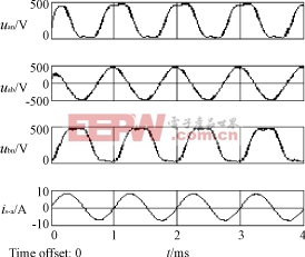 图8及图9分别为感性负载下两种优化模式在1000Hz输出时的仿真波形。其中uan及ubn为经过一阶RC滤波后的相电压波形,uab为RC滤波后的线电压波形,is-a为对应电流波形。由仿真波形可见,采用开关优化模式1时,相电压为典型的马鞍波形,其对应的线电压、线电流谐波含量很小,不过在一个采样周期中开关次数较多。而采用优化模式2时,相电压中出现了微小畸变,使得输出线电流谐波含量增加,但是它的开关损耗仅为前面的67%,这将有利于高频逆变器向更高的控制频率发展。可见二者各有优缺点。