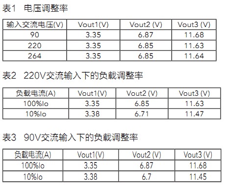 在分别用90V和220V交流输入的情况下,对于不同的输出负载,测试的输出电压值见表2和表3。
