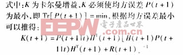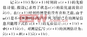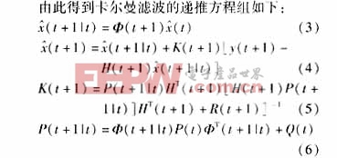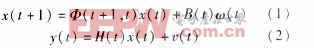 式中:x是n维状态变量,Φ(t+1,t)是n×n的状态转移矩阵,B(t)是n×r的输入噪声转移矩阵,w(t)是p维的输入噪声;y(t)是m维的测量向量,H(t)是m×n维测量矩阵,v(t)是m维的测量噪声。