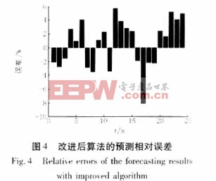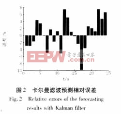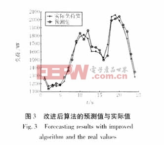 图1是该天24小时的卡尔曼滤波预测值与实际值的比较,图2是24点的卡尔曼滤波的预测误差,其平均绝对相对误差为3.43%,图3是用改进的算法计算该天24小时的负荷值与实际值的比较,图4为改进后的算法的24点的相对误差,其平均绝对相对误差为2.94%,由此可见,改进算法是有效的。