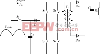 典型的单级Boost PPFC变换器[1]如图6所示,电路在原带隔离变压器Boost拓扑结构中加入了D1,S5及Cb。电路工作时,当检测到输入功率(Pin)小于输出功率(P0)时,S5开通,Cb中的能量释放到输出,这部分能量为P2。当输入功率(Pin)大于输出功率(P0)时,S5关断,通过控制S1~S4使多出的能量存入Cb。因此,电路的控制要实现三个功能,即输入电流控制,输出电压控制和电容电压控制。这种PPFC变换器的主要优点是效率高。由于这三个被控量之间存在耦合关系,所以,控制电路复杂,控制器设计困难;另外,开关管数目多,成本较高,这些都是该变换器的主要缺点。因此,它适用于较大功率场合而不适用于小功率场合。于是文献[6]提出了一种单级反激PPFC变换器,如图7所示。