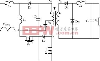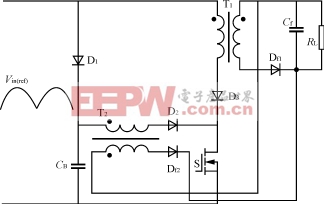 用变压器附加绕组实现负反馈降低了电容电压,提高了效率。但同时降低了功率因数,增加了电流谐波含量。文献[9]针对这一不足提出了一种带低频辅助开关的单级PFC变换器,不仅有效地抑制了电容电压,提高了效率,同时还提高了功率因数,减少了电流谐波含量。