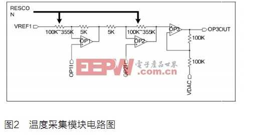 充分利用MXT8051内部资源,温度采集模块采集电路选用MXT8051 Datasheet 中的典型推荐电路,温度传感器选用PT100。具体电路如图2所示。