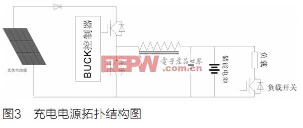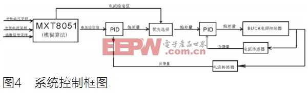 首先以电流闭环为内环控制,控制充电电流的大小;再次以电压闭环为外环控制,控制充电电压大小。控制系统实时采集光伏电池电压,光伏充电电流,并实时计算出实际充电功率,经过MPPT控制软件模块函数不断更新电流给定值,以调节BUCK电源充电电流,实现以最大功率跟踪方式采集太阳能。控制系统实时采集温度信号,根据温度值决定对电池充电电压进行补偿,不断更新电压给定值,限制最大充电电压。其结构框图如图4所示。