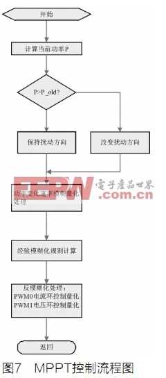 ,光伏电池工作在最大功率点;如果不等,就需要调整输出电流,追踪最大功率点。 图7是MPPT控制流程图。