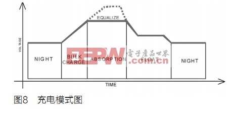 在充电过程中,如果充电电流大于系统设定的最大允许充电电流值(一般为电池容量的0.1倍),此时无需进入MPPT工作状态,控制系统限制充电电流在最大充电电流值以下;只要充电电流小于最大允许充电电流值,就立即进入MPPT充电模式充电,以获取最大的光伏能量。 在充电过程中按照下图充电曲线所示电压值实时监测电池电压,并限制最大充电电压,最大充电电压值由充电电池的特征决定,同时考虑到温度对电池的影响,在一般情况下,铅酸电池以25℃为参考点,单体电池按照-3mv/℃进行温度补偿。这样即能在寒冷的冬天保证电池充满,又能在炎热的夏天有效防止电池充爆。具体的充电时序图8所示。