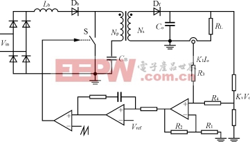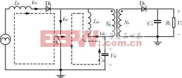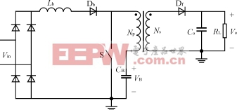 近年来,功率因数校正(PFC)技术引起了人们的广泛关注。传统的两级PFC电路的主要缺点是成本高以及控制电路复杂。单级功率因数校正(SSPFC)变换器[1][2][3][4],将PFC级和DC/DC级结合在一起大大降低了成本。然而,SSPFC变换器在负载变轻时存在直流母线电压过高的问题。文献[2]采用反馈线圈虽然降低了直流母线电压,但却减小了线电流的导通角,从而增加了总谐波畸变(THD)。