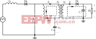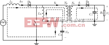 由式(7)可以看出副边电流由两部分组成,负载不但从励磁电感Lm上获取能量而且直接从电感Lb上获取能量,这就意味着一部分能量可以不经过储能电容CB而直接传递给负载,因此,大大提高了效率并且降低了直流母线电压。