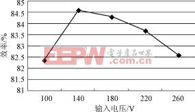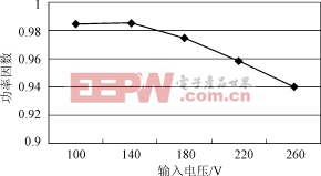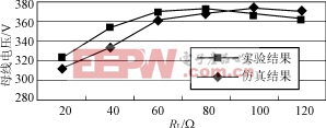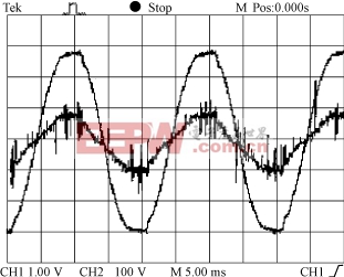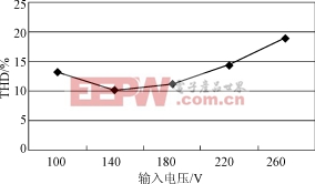 图5为输入线电压和线电流实验波形;图6为输入电压变化时,测量的电路效率,可以看出电路效率在较宽的输入电压范围内可以达到82%以上,比文献[2][3]中所提出的电路的效率要高;图7和图8分别为不同输入电压时,功率因数和THD的测量结果,由图7可见,电路的功率因数在输入电压为100~150V时可以达到0.98,在输入电压为220V时也可达到0.96;图9为输入电压为220V时,在不同负载下直流母线电压VB的仿真与实验结果,仿真与实验都证明在负载变化时直流母线电压VB可以控制在380V以下。