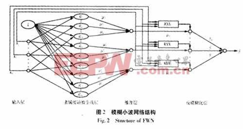 在改进的Takigi-Sugeno模糊神经网络和小波网络的基础上,式(5)-(8)所描述的FWN可以用一个多层网络来实现,如上图2中所示.