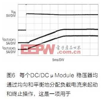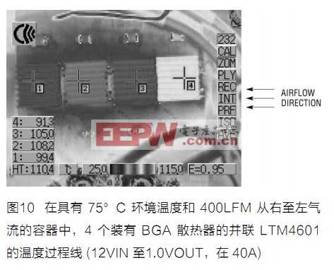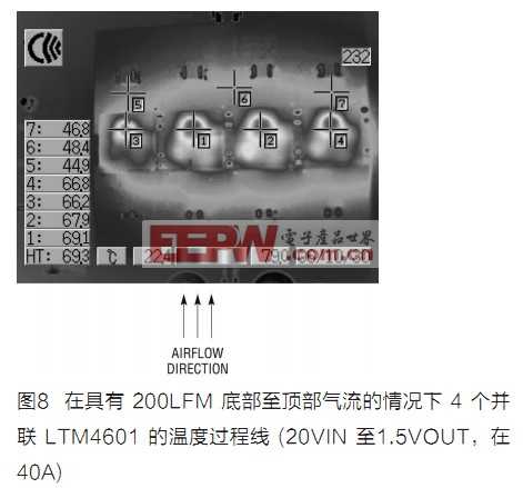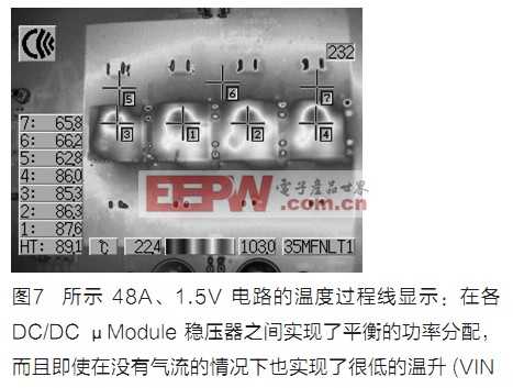 衡。图 6 示出了一个两并联 LTM4601 系统的均匀分布输出电流曲线,当每个 LTM4601 均上升至 10A 的标称输出电流时,该系统总共可提供 20A 的输出电流。 总之,DC/DC µModule 稳压器是独立且完整的系统,其外形尺寸与 IC 芯片相当。扁平、高效率和均流能力造就了适合新一代数字系统的实用型高功率解决方案。凭借平衡的均流和平稳均匀的启动操作,在 48A 输出电流条件下获得了十分出色的热性能。这款设计的简单易行最大限度地缩短了开发时间,同时节省了板级空间。 热性能和布局 通过并联 4 个 DC/DC µModule 稳压器提供 72W 功率 在本文的第一部分里,我们讨论了一款针对四 FPGA 设计的紧凑和扁平的 48A、1.5V DC/DC 稳压器解决方案。这种新方法采用了 4 个并联的 DC/DC µModule 稳压器 (见图 1),以增加输出电流并实现各器件之间的均流。该解决方案所依靠的是这些 µModule 稳压器之间的准确均流,以通过在一个狭小的表面积内均匀地散逸热量来防止热点的出现。每个 DC/DC µModule 器件都是一个完整的电源,具有板上电感器、DC/DC 控制器、MOSFET、补偿电路和输入/输出旁路电容器。µModule 稳压器的占板面积仅为 15mm x 15mm,且高度仅为 2.8mm。这种扁平的外形可使空气在整个电路上顺畅地流动,同时将热量从电路去除 (图 7~10)。此外,由于其高度很低,因此这款解决方案不会对周围的组件产生热遮蔽,从而为实现整个系统的最佳热性能提供了进一步的帮助。 热性能 在缩小 FPGA 型系统尺寸的同时提升其功能、存储容量和计算能力的发展潮流促使设计人员不断改进用于冷却组件的方法。一种简单的方法是在组件的上方提供有效的气流。较高的组件会妨碍气流掠过诸如 FPGA 或存储器 IC 等采用较扁薄封装的器件。在采用预制型 DC/DC 负载点稳压器时,这种阻塞气流的情况将很严重,因为这些器件的高度达到了 FPGA 及其他 IC 高度的 6~10 倍。 在把内部产生的热量从封装的顶部高效地散逸出去的过程中,FPGA 的薄型球栅阵列 (BGA) 封装极为有益。当诸如预制型 DC/DC 稳压器等较高的器件阻止了气流并在其旁边的器件上投下一个“阴影”时,这种好处就被削弱了。 图 7 是图 1 所示电路板的热像,并提供了特定位置的温度读数。光标 1~4 示出了每个模块上的表面温度估计值。光标 5~7 指示 PCB 的表面温度。请留意内侧的两个稳压器 (光标 1 和 2) 与外侧的两个稳压器 (光标 3 和 4) 之间的温度差异。置于外侧的 LTM4601 µModule 稳压器在其左侧和右侧设有很大的平面,从而增强了散热效果,可把器件冷却几度 (℃。内侧的两个 µModule 稳压器则只具有很小的顶部和底部平面用于散逸热量,因此温度比外侧的两个 µModule 稳压器略高。 另外,气流还对系统的热平衡有着实质性的影响。请注意图 2 和图 3 之间的温度差异。在图 7 中,一个 200LFM 的气流均匀地从演示电路板的底部传播至顶部,因而与图 7 中给出的无气流场合相比在电路板上实现了 20℃ 的降温幅度。 气流的方向也很重要。在图 4 中,气流从右至左传播,将热量从一个 µModule 稳压器驱赶至下一个 µModule 稳压器,从而产生堆积效应。位于右边的最靠近气流源的 µModule 器件温度最低。最左边的 µModule 稳压器则由于遭受来自其他 LTM4601 µModule 稳压器的溢出热量而呈现稍高的温度。 至 PCB 的热传导也会随着气流的变化而改变。在图 7 中,热量均匀地传递至 PCB 的左侧和右侧。在图 9 中,大部分热量移动至左侧。图 10 示出了一种极端的情形 —— 热量从一个 µModule 器件堆积至下一个 µModule 器件。4 个 µModule 稳压器均各安装了一个 BGA 散热器,而且整个电路板在一个环境温度为 75°C 的容器中运作。