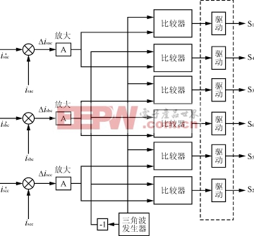 与isac的偏差Δisac经放大器A放大后再与三角波进行比较。放大器A采用比例放大器或比例积分放大器。这种控制方式是基于将Δisac控制到最小来进行设计的。其优点是输出电压中的谐波含量较小,只含有与三角波频率相同的谐波,滤波比较容易。其缺点是硬件比较复杂,跟踪误差稍大,响应速度稍慢。