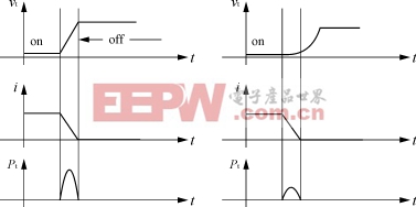 1)未加缓冲电路和加入缓冲电路之后开关管电压Ut和电流i及功耗Pt的波形如图7所示。由图7可知,加RC缓冲电路后,开关电压上升速率减慢,