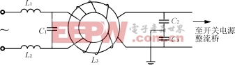 本电路中主要的EMI是电源噪声对电网的干扰。可将原来的共模扼流圈L2与电容C10、C1组成的滤波电路,改善为如图8所示电路,则L1、L2、C1可除去差模干扰,L3、C2、C3可除去共模干扰。L1、L2的磁芯为不易饱和的材质。C1可选陶瓷电容,耐压必须考虑输入电压的最大可能值,通常选用0.22~0.47μF。L3是共模扼流圈。选定C=C2=C3,截止频率f0,则可根据L3=