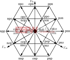 在传统三相两电平逆变器中,电压空间矢量个数为23=8[2]。根据三相两电平逆变器电压空间形成原理,箝位二极管式电压型三电平逆变电路的电压矢量合成图如图2所示,表1是它的每相开关状态表,总共有33=27个合成电压矢量。与三相两电平逆变器不同,三电平逆变器电压矢量可分为长矢量,中矢量,短矢量和零矢量,其中ppp,ooo和nnn是零矢量;还有12个短矢量(模长=