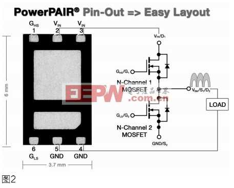 双片PowerPAIR功率封装使用对称结构,适用于DC-DC降压转换器。这种封装适合高边MOSFET的裸片和硅片降压转换器的低边MOSFET,并做了优化。这意味着,如图2所示,由于焊盘区的大小不一样,低边MOSFET的导通电阻比高边MOSFET的导通电阻更低。