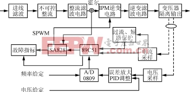 系统结构如图1所示。主电路主要完成整流逆变功能。不可控整流电路对输入电网电压直接整流,通过LC滤波电路,产生平滑的高压直流。逆变电路采用SPWM,滤除高频谐波,经变压器隔离,输出理想正弦波。电压、频率信号通过A/D转换后,数据经CPU处理,送到SA828控制寄存器,产生SPWM信号,通过改变SA828控制寄存器输出,实现调频调压的功能。