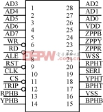 SA828是MITEL公司近年来推出的三相SPWM电机控制数字集成芯片,它可以实现全数字化三相逆变器所需要的6路SPWM控制信号,属于规则采样双边调制波,很适合用于输出为正弦波的逆变电源。该芯片双列直插式28引脚如图2所示。该系列有SA828-1、SA828-2两种型号产品,有关寄存器各状态位的功能以及各寄存器的使用方法参阅文献[1]。基准正弦是存储在SA828内部的ROM正弦表。当写完初始化数据后,立即生成0°-90°的正弦波。该正弦波通过相位与控制逻辑拓展形成三相6路SPWM信号。该信号再经过取消窄脉冲电路,送到脉冲延迟电路,生成死区时间,然后送到各引脚出口。于是由内部硬件直接产生SPWM信号,这样保证SPWM信号生成的可靠性。