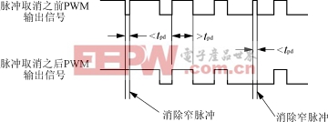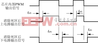 死区时间tpdy是为了避免上下臂直通而设置的延迟时间,其关系如图4所示。有些窄脉冲可能引起功率管来不及开通,却要立即关断,因而设置脉冲取消时间tpd。输出SPWM信号与脉冲取消时间tpd如图5所示。脉冲取消时间tpd=输出最小脉宽+tpdy;例如,输出最小脉宽为4μs,tpdy=4μs时,则tpd=8μs。完成初始化编程后,其中R0、R1、R2三寄存器状态为D0H、81H、28H。