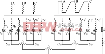 在我国大型核聚变装置、强磁场装置及电解、电镀等方面的应用中,经常需要电压为几V至十几V、电流为几kA至几十kA的可调直流电源。在这种低电压大电流可调直流电源的设计中,一般采用双反星形带平衡电抗器整流电路。由于受晶闸管最大额定电流的限制,在很多情况下必须采用晶闸管并联才能满足要求。另一方面由于双反星形带平衡电抗器整流电路输出的直流电压为6脉波,不能满足如核聚变装置、强磁场装置等这种对纹波要求较高的场合[1]。为了减小输出直流电压的谐波含量和减轻整流装置高次谐波电流对电网的影响,也为了减少晶闸管并联过多对装置设计带来的麻烦,可以采用两组双反星形带平衡电抗器整流装置(一组整流变压器原边接成星形,另一组接成三角形)并联运行,从而使相电压移相30°达到12相的整流效果。按照常规设计,需在两组整流装置输出端之间接一平衡电抗器来限制两组整流装置之间的环流。本文通过对两组整流装置并联运行时的环流进行分析,得出了两组整流装置之间可以不加平衡电抗器即可完全满足工程需要的新结论,通过仿真证明了此结论的正确性。