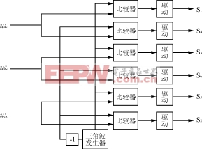 上述开关无损缓冲电路,也可以应用于单相全桥与三相半桥逆变器,如图4和图5所示。由图4和图5可知,它们都是由单相半桥逆变器组成的,图中Cd1和Cd2为共同直流分压电容,故工作原理与缓冲电容的充放电方式与半桥逆变器相同。这里必须指出的是,对于图4所示单相全桥逆变器,当采用图6(a)所示单极性SPWM脉冲控制时,直流分压电容Cd1和Cd2可以不用。例如主开关S1和S4在输出正半周,按图6(a)所示单极SPWM脉冲波形工作时,缓冲电容的充、放电路径如图4中点划线和虚线所示。逆变器的SPWM控制电路如图6(b)、(c)所示,其中图6(b)用于单相全桥逆变器,图6(c)用于三相半桥逆变器。