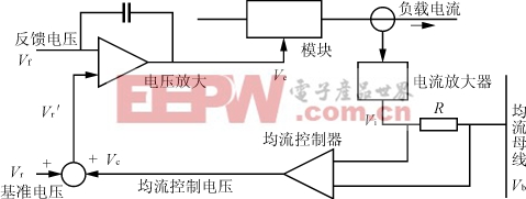 母线电压Vb是Vi1和Vi2的平均值。也代表了模块1,2的输出电流平均值。代表均流误差的Vi与Vb之差,经过调节放大器,输出调整电压Vc,Vc值可正可负。当Vb=Vi时,电阻R上的电压为零,调整电压Vc=0,实现了均流。一旦模块间的电流分配不均匀,Vb≠Vi,电阻R承受电压,此时Vr′=Vr±Vc,电路通过调整放大器改变Vr′,以达到均流目的。