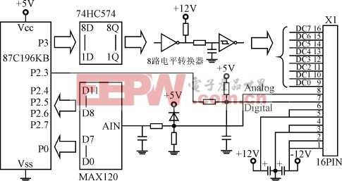 电池巡检的监控接口电路框图如图2所示,它也是测控总线的接口电路。把单片机87C196KB的P3口 用 锁 存 器 74HC574扩 展 成 测 控 总 线 驱 动 电 路 , 经 8路 电 平 转 换 器 转 换 后 , P3口 的 数 据 作 为 测 控 总 线 接 口 X1的 功 能 扩 展 控 制 信 号 ( DC0~ DC7) , 即 各 个 功 能 扩 展 板 的 公 共 控 制 信 号 。 各 个 功 能 扩 展 板 所 采 样 的 模 拟 量 ( Analog) 和 数 字 量 ( Digital) 分 别 接 到 X1的 8# 和 7# 引 脚 ( 作 为 公 共 数 据 输 入 通 道 ) , 模 拟 量 经 12位 高 速 A/D转 换 器 MAX120处 理 后 输 入 到 87C196KB的 P0和 P2口 , 数 字 量 输 入 到 87C196KB的 P2.3引 脚 。 针 对 电 池 巡 检 板 而 言 , 模 拟 量 是 分 时 输 入 的 每 节 电 池 电 压 信 号 , 数 字 量 是 分 时 输 入 的 每 节 电 池 极 性 信 号 , 其 它 功 能 扩 展 板 的 测 量 信 号 不 再 赘 述 。