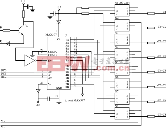 电池采样单元BSU的设计思路是,通过MAX397双路分时依次驱动PhotoMOS继电器AQV214,把每节电池电压选送到采样总线VC+与VC-上。