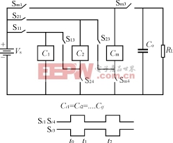 在状态I,Si1和Si4导通,Si3截止,C1....Cm并联充电,而根据串并电容组合结构的特点,构成Ci的ni个电容Cij却呈串联状态;同样地,在状态II,Si1和Si4截止,Si3导通,C1....Cm串联放电,而构成Ci的ni个 电 容Cij却 呈 并 联 状 态 。 在 状 态I,Co放 电 提 供 负 载 电 流,在 状 态II,C1....Cm向Co补 充 电 量 。 同 时Co起 到 输 出 滤 波 的 作 用,这 样 便 能 得 到 一 个 平 滑 的 输 出 电 压 。