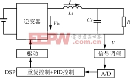 采用电压霍尔对输出电压进行采样,采样周期为20kHz。电压霍尔输出信号经调理电路送入DSP模/数转换单元,并将转换结果暂存于DSP中,由此得到输出电压的反馈信息。将采样得到的反馈信息与给定正弦表的相应数据进行比较,得到偏差信号。将偏差信号及给定信号按一定的控制算法进行计算,就得到脉宽控制量。在本系统中,控制算法采用的是重复控制加PID控制的方法,前者保证输出波形的稳态性能,后者保证输出波形的动态性能。