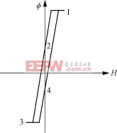 饱和电感的磁滞回线如图2所示,其工作过程如下:到达工作点1时(电流导通),磁芯处于饱和状态,具有非常低的电感量。当电流关断时,工作点到达剩磁点2。二极管的反向恢复效应使得电流向小于零的方向减小,这时,由于钴基非晶有非常高的磁导率,因此它的电感量很大,有效地抑制了二极管的尖峰电流,实现了二极管的软恢复。由于高电感值,阻止了磁芯工作在工作点3,而留在反向剩磁点4,然后被磁化开始下一个循环。