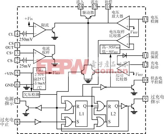 UC3906内部框图如图1所示。该芯片内含有独立的电压控制电路和限流放大器,它可以控制芯片内的驱动器。驱动器提供的输出电流达25mA,可直接驱动外部串联调整管,从而调整充电器的输出电压和电流。电压和电流检测比较器检测蓄电池的充电状态,并控制充电状态逻辑电路的输入信号。