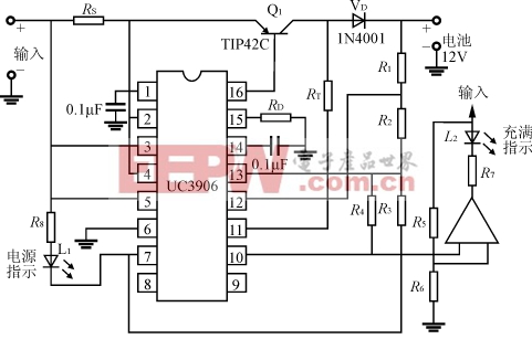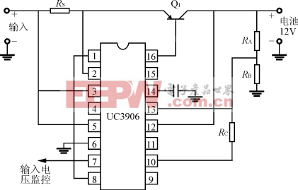 UC3906的一个非常重要特性就是具有精确的基准电压,其基准电压随环境温度而变,且变化规律与铅酸电池电压的温度特性完全一致。同时,芯片只需1.7mA的输入电流就可工作,这样可以尽量减小芯片的功耗,实现对工作环境温度的准确检测,保证电池既充足电又不会严重过充电。除此之外,芯片内部还包括一个输入欠压检测电路以对充电周期进行初始化。这个电路还驱动一个逻辑输出,当加上输入电源后,脚7可以指示电源状态。