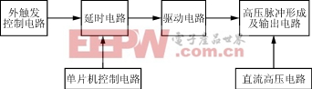 延时可控高压脉冲发生器结构框图如图1所示,是由外触发控制电路、单片机控制电路、延时电路、驱动电路、直流高压电路及高压脉冲形成及输出电路等组成。