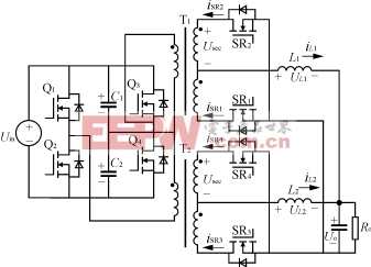 图11为对称半桥倍流整流拓扑,两个输出滤波电感的电流相位相差180°,与双通道交错并联拓扑存在相似的电感电流纹波互消作用,对应D=0.5时,可以实现完全的电流纹波互消作用(输出电流纹波为零)。在应用于负载对动态响应要求不高的场合时,可以把稳态占空比选定为0.5,从而大大减小输出滤波器的体积。但对于数据处理器这类对动态响应有较高要求的负载时,不能把0.5这一满占空比作为稳态占空比。但当D偏离0.5时,其纹波互消作用则会大大削弱,限制了输出滤波器参数的取小,降低了功率级的能量传输速度。在这种情况下利用交错并联技术,把两个对称半桥倍流整流拓扑进行交错并联,如图12所示,则可实现与四通道交错并联QSW电路相似的纹波互消作用(Dmax0.5)此时,若把稳态占空比定在0.25,则可实现稳态时完全的纹波互消作用,输出滤波电感也可以取得很小,从而在负载突升(D:0.25→0.5)和突降(D:0.25→0)时,具有对称的快动态响应。