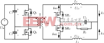 在相对较高输入电压时(如48V总线电压),采用对称半桥电路作为主电路拓扑。副边整流电路可采用全波整流结构或倍流整流结构。