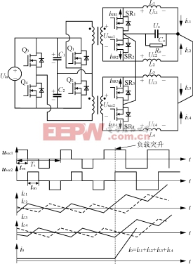 如图9所示,让对称半桥全波整流电路按照QSW方式工作,在所有负载范围内电感电流都从正到负变化,则可实现原边开关管在开通之前,电感电流反映到原边,流过即将开通的开关管的体二极管,实现ZVS。而且在负载突升时,输出滤波电感的等效占空比可达到100%,整个周期都会有正压加在输出滤波电感上,来提升电流;负载突降时,滤波电感的等效占空比可以为0%,整个周期都会有负压加在电感上,来降低电流。具有与单通道QSW电路相似的动态响应特性。应用交错并联技术,把两个对称半桥全波整流电路并联起来(如图10所示),取稳态占空比为0.5,可实现完全的输出电流纹波互消作用,大大减小输 出 滤 波 器 , 在 负 载 突 升 和 负 载 突 降 时 , 具 有 对 称 的 快 速 动 态 响 应 。