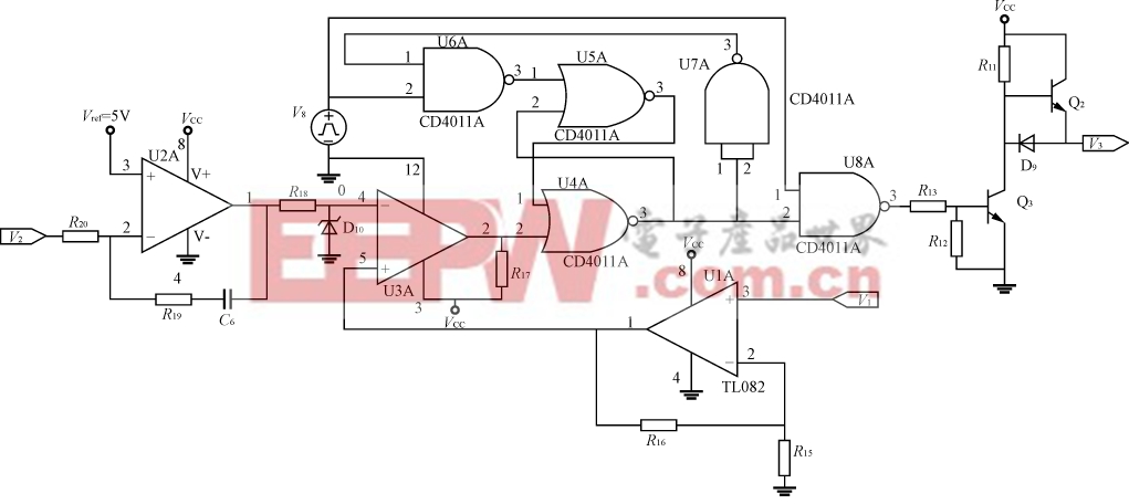图1中,V8为振荡电路产生的振荡脉冲,其占空比为50%,由该脉冲决定开关器件的工作频率。V1为原边电流采样电阻上的压降,V2为输出电压的反馈值,V3是用于驱动开关管的信号。V2经过PI调节器进行误差放大后输入到比较器的反向端,与输入到比较器同向端的经过误差放大后的V1值进行比较,从而决定V3的脉宽大小。逻辑电路产生的信号经过输出级后用来驱动MOSFET的开通和关断,该信号(V3)的占空比与输出电压的反馈值V2成反比,实现电压反馈式的控制环,同时,该信号的占空比还与输入的直流电压值成反比,以实现电路的前馈控制。V3信号由经过放大后的原边电流的采样电阻上的电压值和经过PI调节器的输出电压的反馈值共同来控制。图2为各个反馈信号的误差放大值、振荡脉冲V8以及MOSFET的驱动信号V3波形。图2中1)为振荡脉冲V8的波形,2)为驱动信号V3的波形,3)、4)为电压反馈和电流反馈值经过误差放大后的波形(V2和V1的波形)。