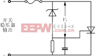 输出过电压保护在开关稳压电源中是至关重要的。特别对输出为5V的开关稳压器来说,它的负载是大量的高集成度的逻辑器件。如果在工作时,开关稳压器的开关三极管突然损坏,输出电位就可能立即升高到输入未稳压直流电源的电压值,瞬时造成很大的损失。常用的方法是晶闸管短路保护。最简单的过电压保护电路如图4所示。