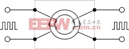 脉冲变压器的匝数较少,而且一次绕组和二次绕组分别绕于铁氧体磁芯的两侧,这种工艺使得它的分布电容特小,仅为几个pF,所以可作为脉冲信号的隔离元件。脉冲变压器传递输入、输出脉冲信号时,不传递直流分量,因而在微电子技术控制系统中得到了广泛的应用。一般地说,脉冲变压器的信号传递频率在1kHz~1MHz之间,新型的高频脉冲变压器的传递频率可达到10MHz。图5(a)是脉冲变压器的示意图。脉冲变压器主要用于晶闸管(SCR)、大功率晶体管(CTR)、IGBT等可控器件的控制隔离中。图5(b)是脉冲变压器的应用实例。