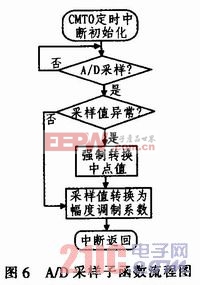 A/D采样函数流程图如图6所示,此函数主要是用于采集负载端的的电压值,最后转换为幅度调制系数。本此函数中使用了CMT0定时器中断,在此中断中进行了A/D采样,将采集的电压值与换算后的电源电压中点值Vmid(见图4,即利用R7、R8组成分压电路,R7:R8=9:1),进行比较,当差值的绝对值大于100的时候,判断为采集值出现异常,强制将电源电压转换后的中点值转换为幅度调制系数,当二者之间的差值的绝对值小于100时,将差值加到Vmid上,然后再转换为幅度调制系数,最后返回中断。