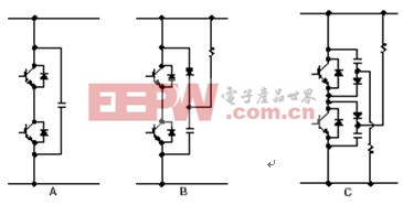 整流电路在输入侧要接抗雷击过电压或操作过电压吸收电路,这种吸收电路由星形连接的高频、高压电容器(如470p/2Kv)和压敏电阻(如20k/1Kv)组成,具体电路见图1中R1、R2、R3 和C1、C2、C3。逆变器部分在高频开关状态时,产生电压尖脉冲,如果不加以处理将损坏IGBT模块、干扰驱动电路。采用吸收电路可以抑制电压尖脉冲,当前变频器中常用的吸收电路有三种形式,如图2 所示,根据所用开关器件和功率等级来选择使用。