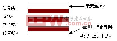 在整个PCB中,布线过程限定最高、技巧最细、工作量最大,布线不当会产生严重的电磁干扰。以变频器控制电路为例,布线中应遵循如下基本原则:电路板尽量采用四层板;印制导线的布设应尽可能短,拐弯成圆角;印制导线宽度最小不宜小于0.2mm,间距一般可取0.3mm,公共地线应尽可能的粗;布线顺序应遵循先布高频线(如PWM 信号线)、干扰线(如晶振走线), 后布普通线;数字区与模拟区尽可能隔离,并且数字地与模拟地要分离;多层线路板的电源和地线是由不蚀刻的铜箔板形成,这种大的接地平面形成了极低的电源阻抗。因此多层板的优点在于对公共耦合阻抗不太敏感,且提供了屏蔽。下图4给出四层板布线示意图。